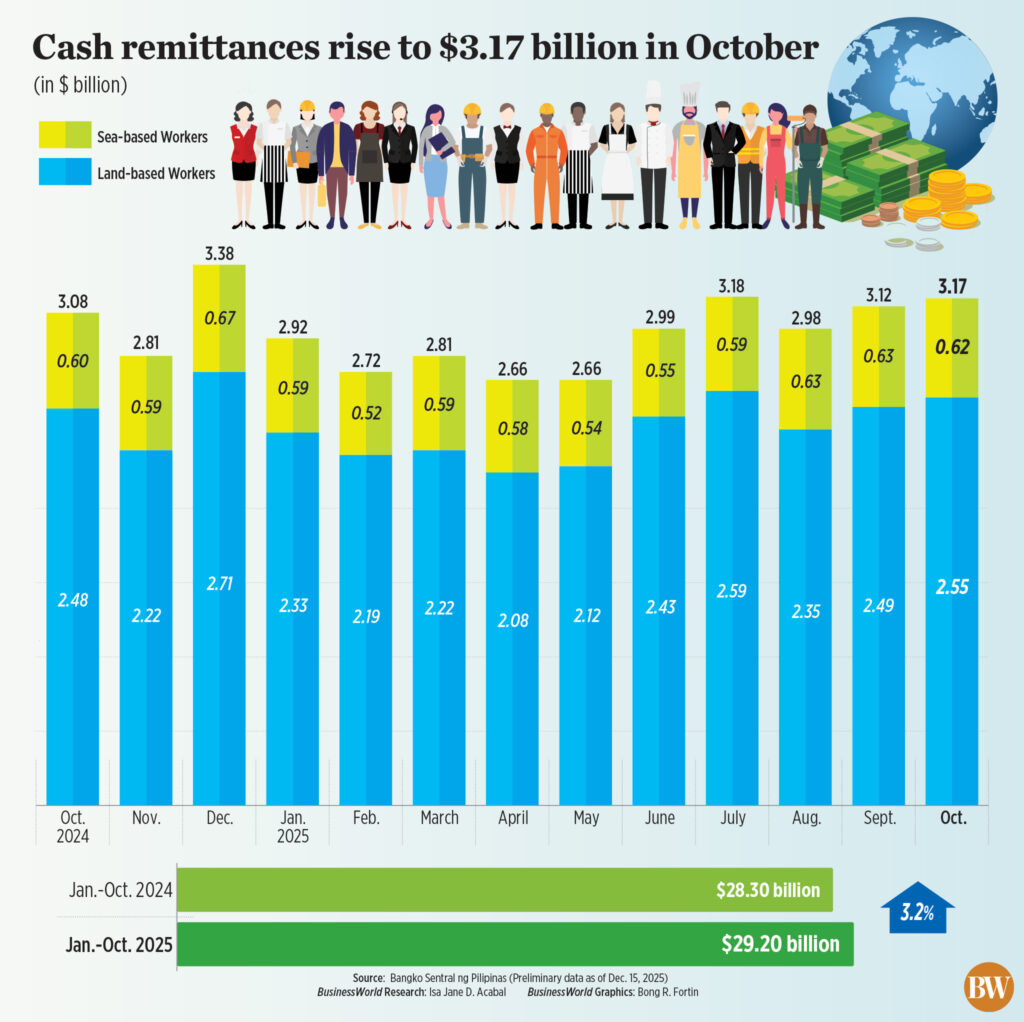 “Le rimesse di contanti dai filippini all’estero sono state pari a 3,17 miliardi di dollari nell’ottobre 2025 e a 29,2 miliardi di dollari nel periodo gennaio-ottobre 2025”, ha affermato la banca centrale in una nota.